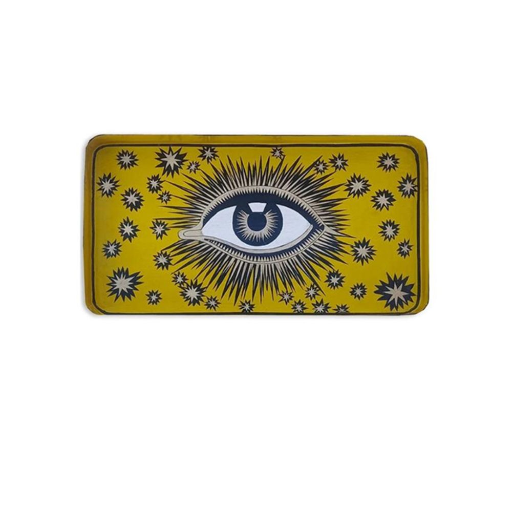 Bandeja Eye Hand Amarilla 32x17 Cm, se manifiesta en forma de un detalle pintado a mano en esta bandeja de hierro. Combinando tonos de amarillo, dorado y negro para un acabado mágico, esta bandeja rectangular es ideal para guardar pequeñas joyas.