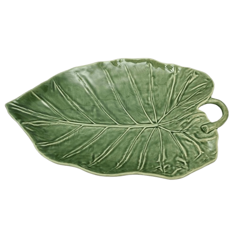 Bandeja grande en forma de hoja (42 cm) de Bordallo Pinheiro. Vajilla artesanal portuguesa con relieve verde y esmalte resistente en Carmiña Villegas.