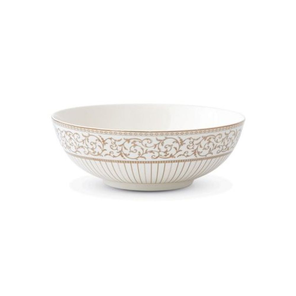 Bowl dorado de 23 cm en porcelana de vajilla italiana, ideal para servir ensaladas, frutas o preparaciones especiales con un toque sofisticado. Su acabado dorado aporta elegancia y realce a cualquier mesa, perfecto para uso diario o para ocasiones especiales.
