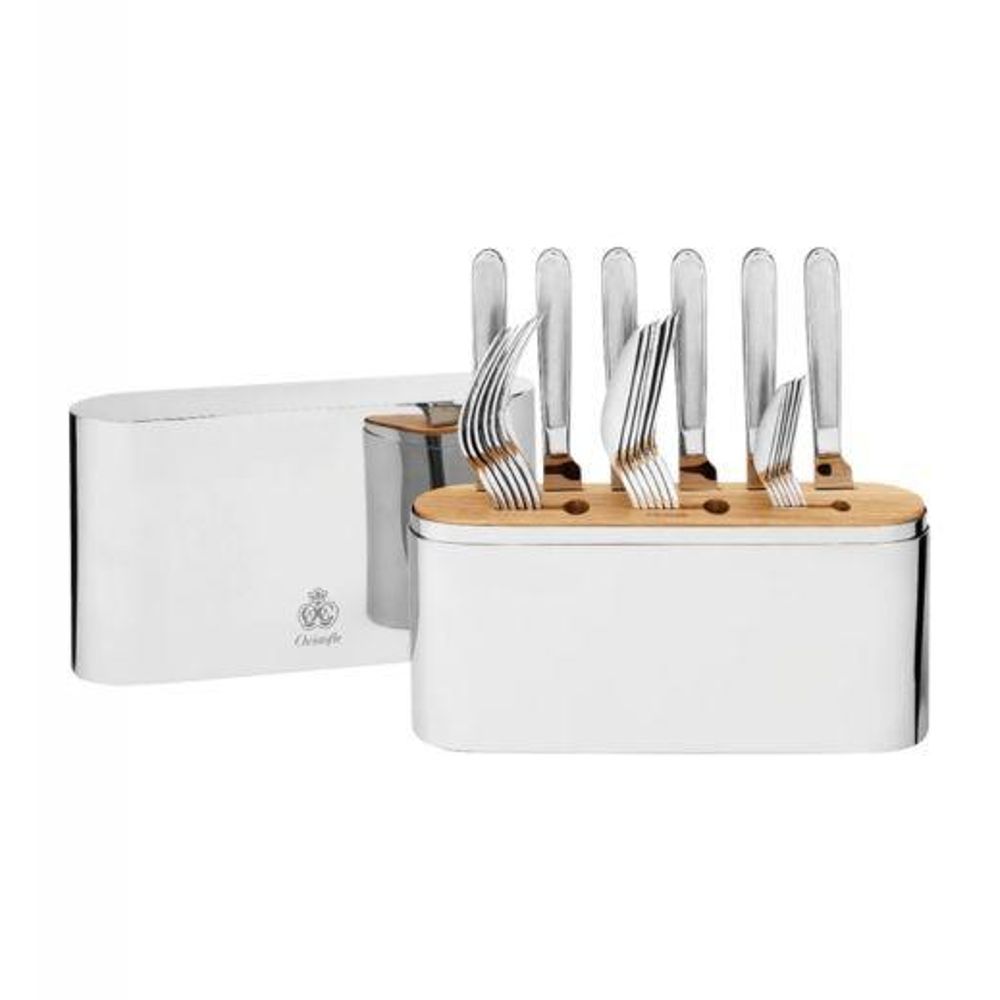 Juego de 24 piezas en acero inoxidable para 6 personas Presentado en estuche de acero pulido espejo con interior en madera de roble blanco. Inspirado en la elegancia oblonga de la Plaza de la Concordia de París, combina diseño y funcionalidad.