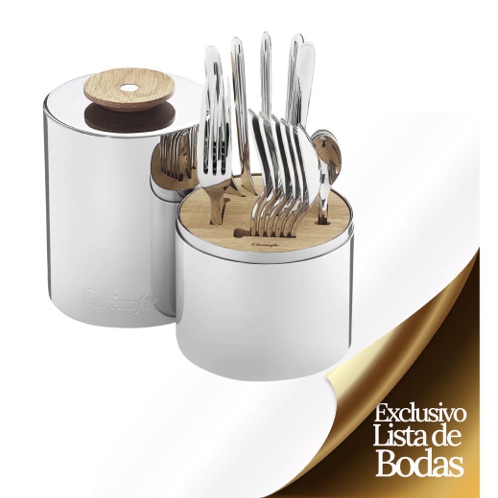 Composición 6 unidades de: Cuchara Principal, Tenedor Principal, Cuchillo Principal, Cuchara de Te. Estuche cilíndrico de líneas sobrias y estilizadas.