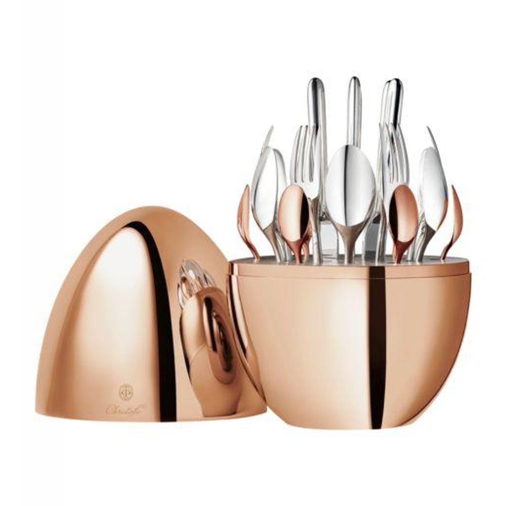 MOOD Precious Set de cubiertos 24 piezas, con cucharillas de café en acabado oro rosa y combinación de plata. Presentado en estuche de acero inoxidable color cobre con interior en madera de nogal y soporte de resina. Elegancia contemporánea para brunch o cenas informales.