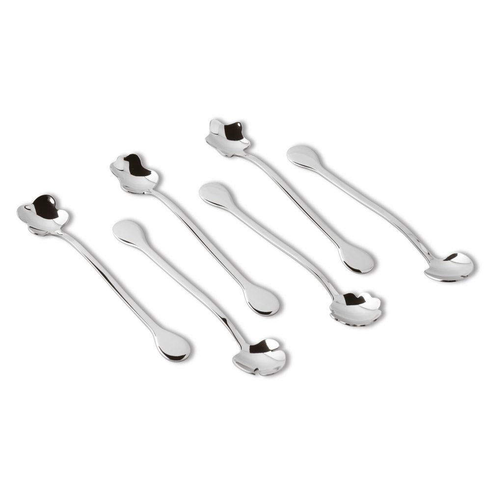 Juego de seis cucharas ideal para servir bocadillos, postres o acompañar café, perfecto para aperitivos Diseño minimalista cada mango presenta una forma diferente inspirada en los pétalos de flores, reinterpretadas con líneas esenciales.