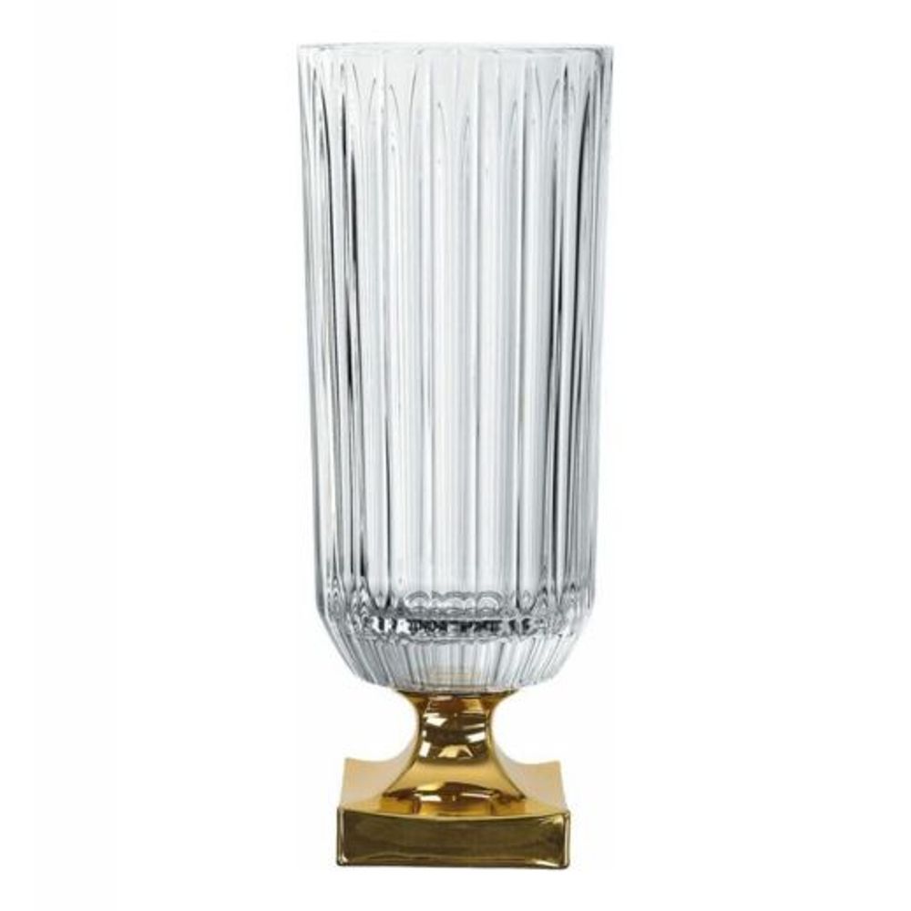 El Jarrón con Pie Dorado presenta una base de metal precioso en deslumbrante oro como acento brillante. La base tiene una auténtica aleación de metal precioso aplicada a mano y luego cubierta con un barniz para un acabado duradero que no se empaña. El resultado es un punto focal de gran lujo para un estilo interior elaborado.