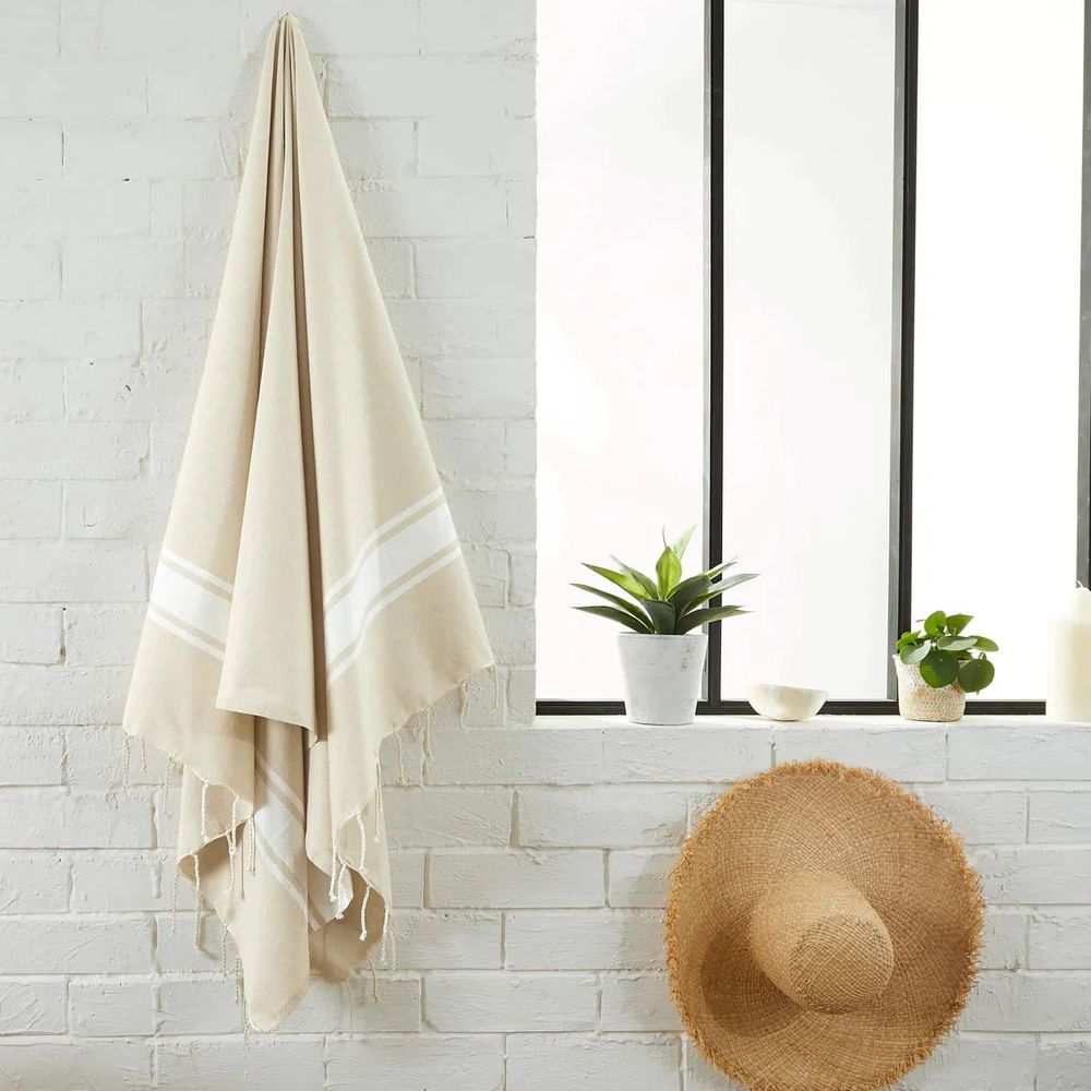 La Manta Marroquí Tissage Plana en color Sahara redefine el concepto de la fouta tradicional. Con su tejido liso y su tono arena cálido, esta pieza de la casa Byfoutas evoca la serenidad de los paisajes naturales, convirtiéndose en el accesorio definitivo para sus escapadas a la playa, días de piscina o rituales de spa.