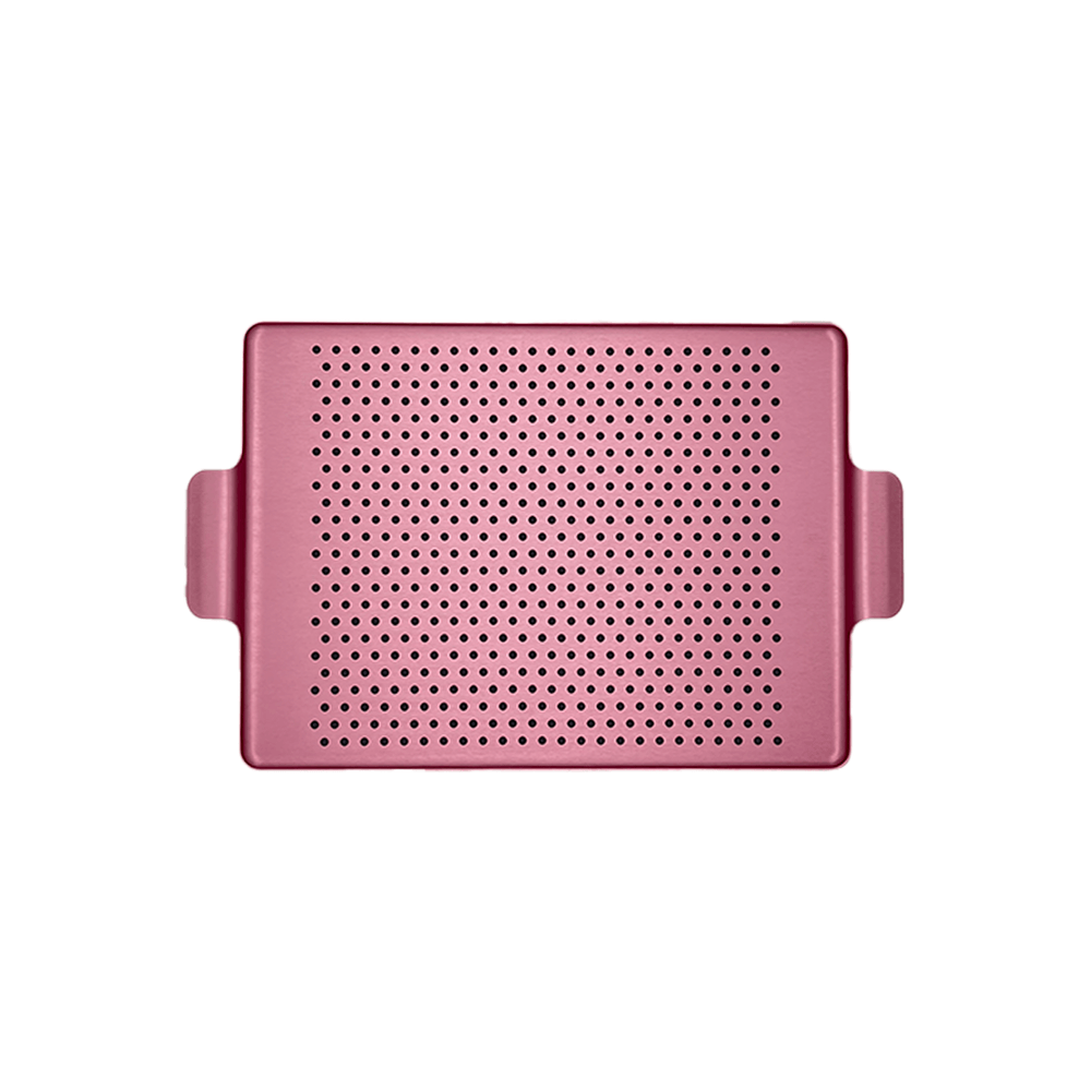 Bandeja de 16.8 x 16.8 cm, creado por la compañia Kaymet, especializada en el trabajo de piezas ultralivianas en Aluminio prensado con acabados antideslizantes en silicona protector para elementos calientes, se pueden poner moldes que salen de horno en colores metalizados.