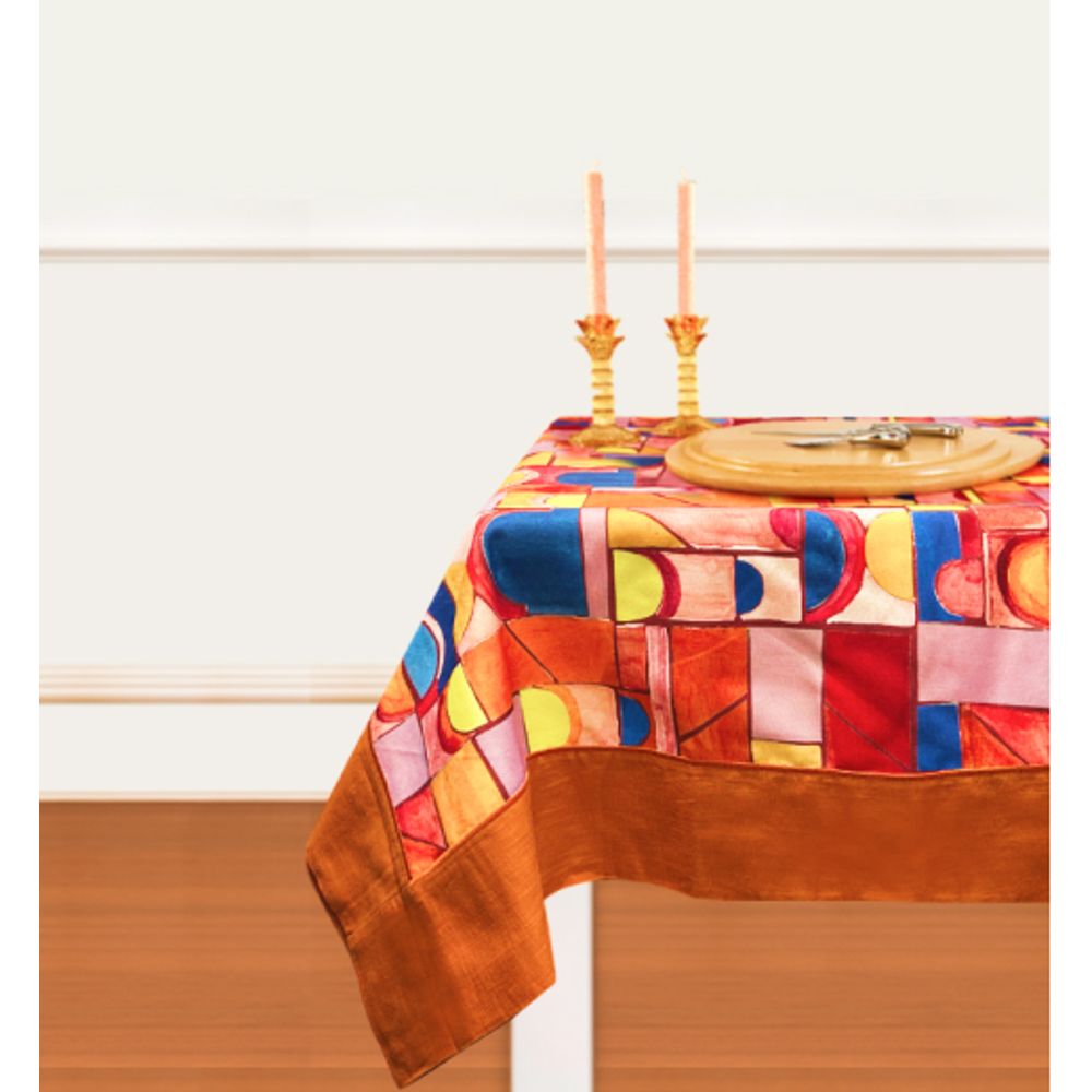Mantel Sophie 8 Puestos 170x350 Cm Carmina Villegas, multicolor con diseños de artístico y cenefa lila, la composición es de 70% lino y 30% algodón, apto para lavadora 30° en ciclo delicado, no utilizar secadora, se puede almidonar y planchado a temperatura media.