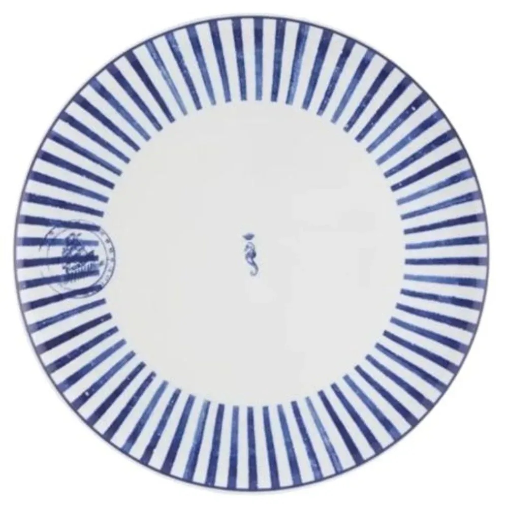 El plato sitio-base Transatlântica de 33 cm de Vista Alegre es una pieza que evoca la tradición naviera de Portugal a través de un diseño sofisticado y lleno de historia. Su formato coupe, sin ala, y su decoración en tonos azules crean una estética fluida que transmite movimiento, profundidad y elegancia.