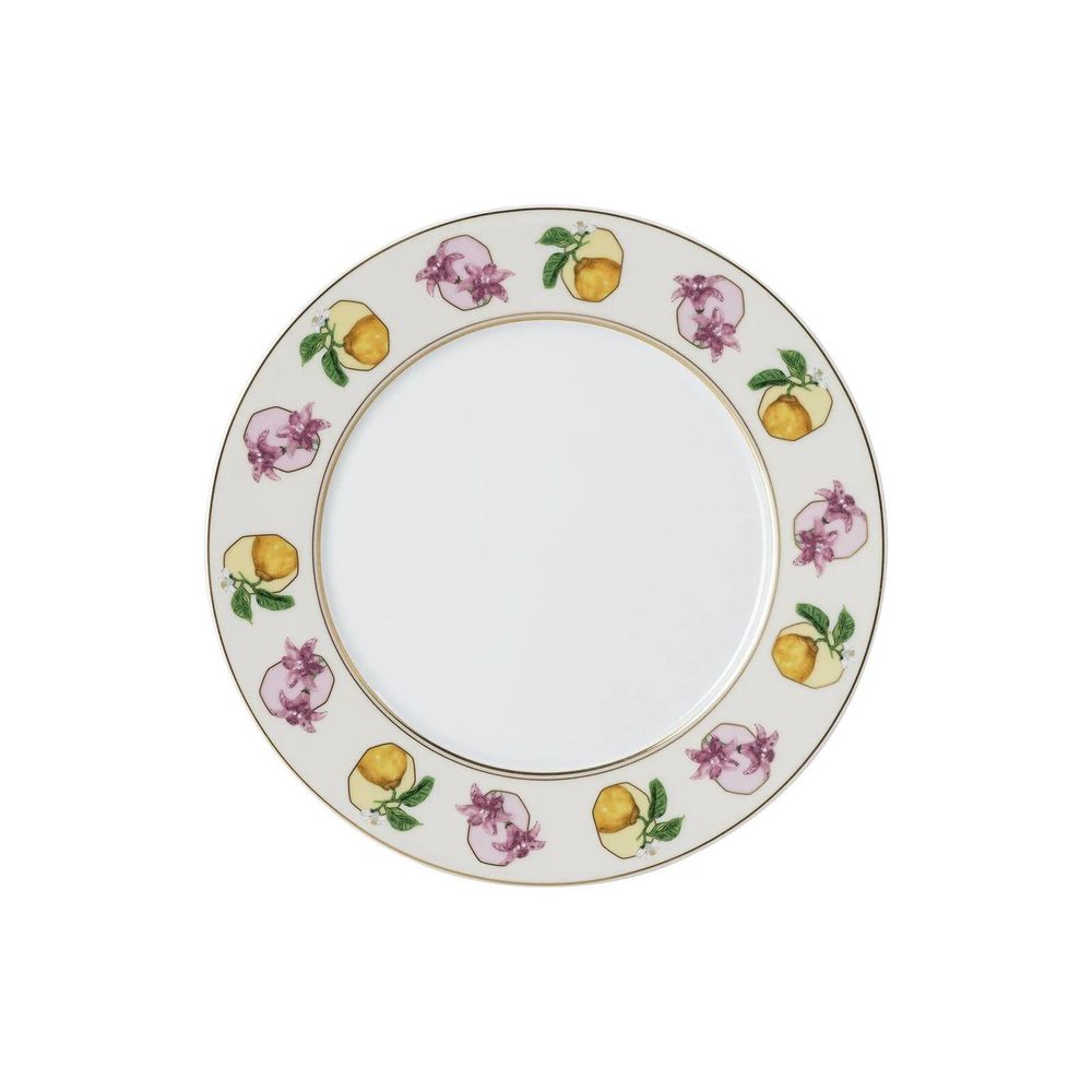 Elaborado en fina porcelana en un suave rosa malvavisco, este elegante plato está adornado con delicadas ilustraciones florales y motivos inspirados en limones.