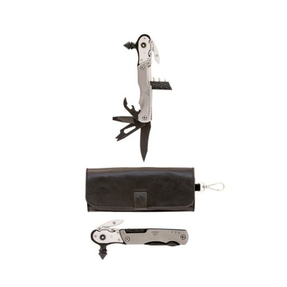 Herramienta Rompe Cristal multifuncional con diseño moderno y detalles tipo engranaje. Incluye punta rompecristales, funciones adicionales de utilidad y presentación en elegante caja de regalo negra. Práctico, resistente y ideal para llevar en el auto o como obsequio.