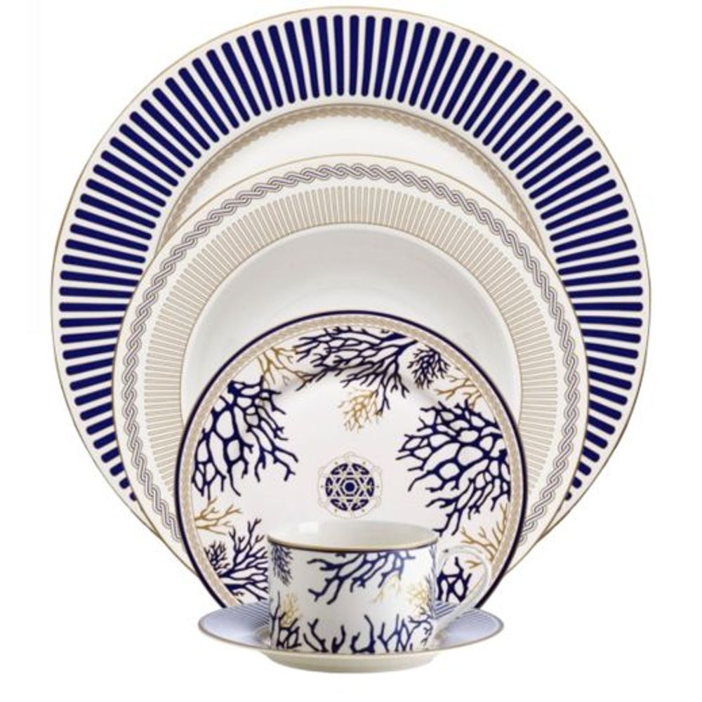 El juego Corallo surge de las profundidades del agua con su color azul y detalles dorados. Las encantadoras ilustraciones evocan el mundo y la vida marina. Lleve la belleza del mar y la sofisticación a sus mesas.
