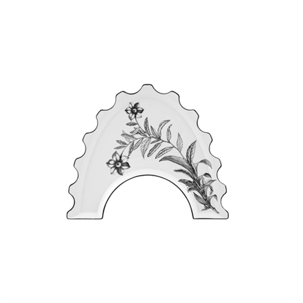 Bandeja media luna, l as sutiles líneas de Herbariae se inspiraron en cinco flores: la amapola, el narciso, el loto, la dalia y el cardo.Elegidos por el poder de su evocadora pero delicada belleza, adornan cada pieza de esta colección.Dibujadas al estilo de antiguos herbarios y obras botánicas, dentro de márgenes estilizados bordeados con una línea negra, las imágenes destacan por su blanco y negro contrastante, y en su núcleo de colores más suaves - rosa, amarillo, verde y azul pavo real -, que evocan acuarelas.